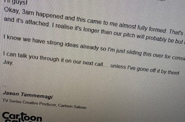 We quickly put together a little team. Paul would direct. I would produce. And we would bring in Will Collins to write. Will wrote WolfWalkers and Song of the Sea and he is known to be incredible, although I had never worked with him before. When I met him, just as everyone had said, he was wonderful. An incredible collaborator and a lovely guy. Will is absolutely the best. This felt like a perfect team.